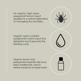 Details : My organic virgin neem peppermint lemon insect repellent is a natural alternative to managing tics and flees, the active ingredients are.